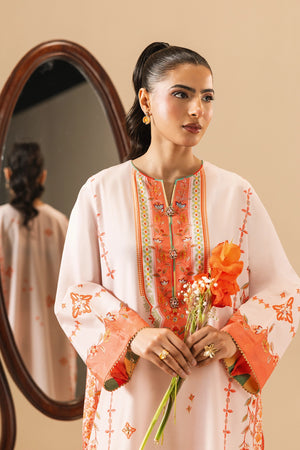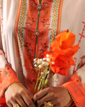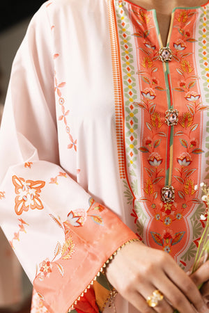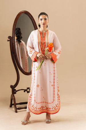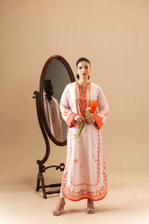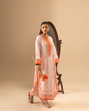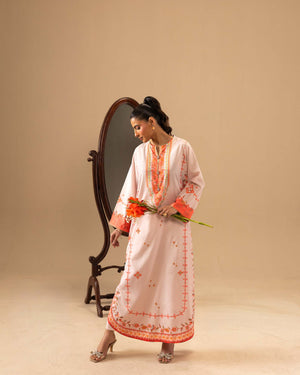 Shirt: A printed kaftan crafted in silk, designed in a soft light pink base. The silhouette features a round neckline with a slit cut opening, delicately handwork detailed with colorful trims, dull gold gota on each motif, and ornamental buttons accented with beads and a central pearl. Gently flared full-length sleeves and a rounded hem with triangle gotta lace.
